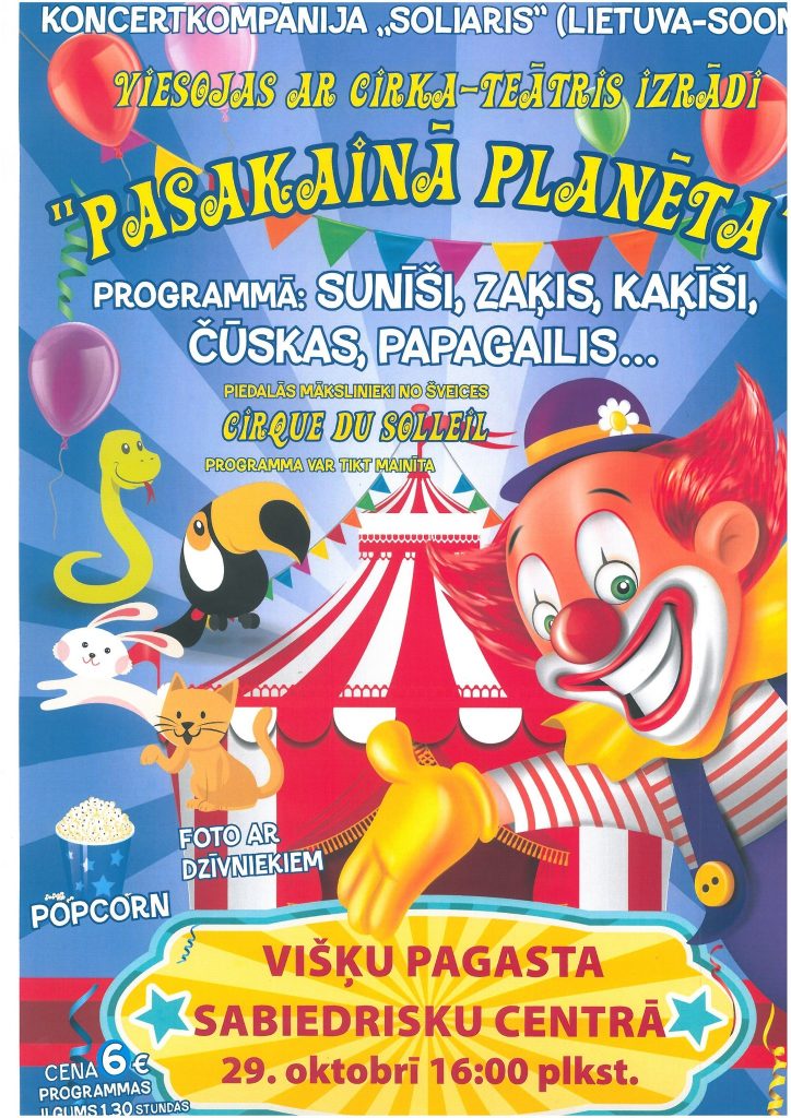 29.oktobrī plkst. 16.00 Višķu tehnikuma aktu zālē notiks cirks no Lietuvas ar programmu “Pasakainā planēta”.
