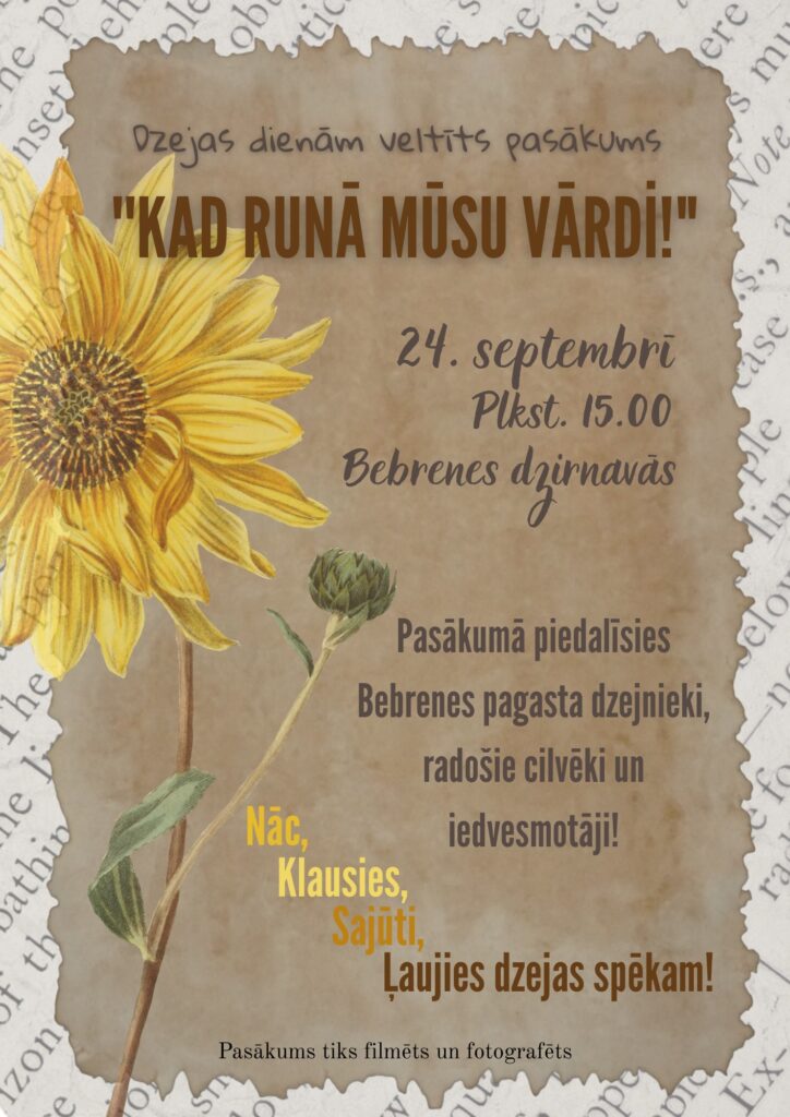 Visi ir aicināti uz dzejas dienām veltītu pasākumu “Kad runā mūsu vārdi!” 24. septembrī plkst. 15.00 Bebrenes dzirnavās.