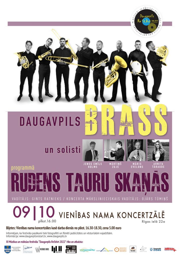 9. oktobrī plkst. 16.00 Vienības nama koncertzālē 11. Mūzikas un mākslas festivāla “Daugavpils Restart 2022” ietvaros ar koncertprogrammu “Rudens tauru skaņās” uzstāsies instrumentālais ansamblis “Daugavpils BRASS” (vadītājs Gints Ratnieks) un solisti.