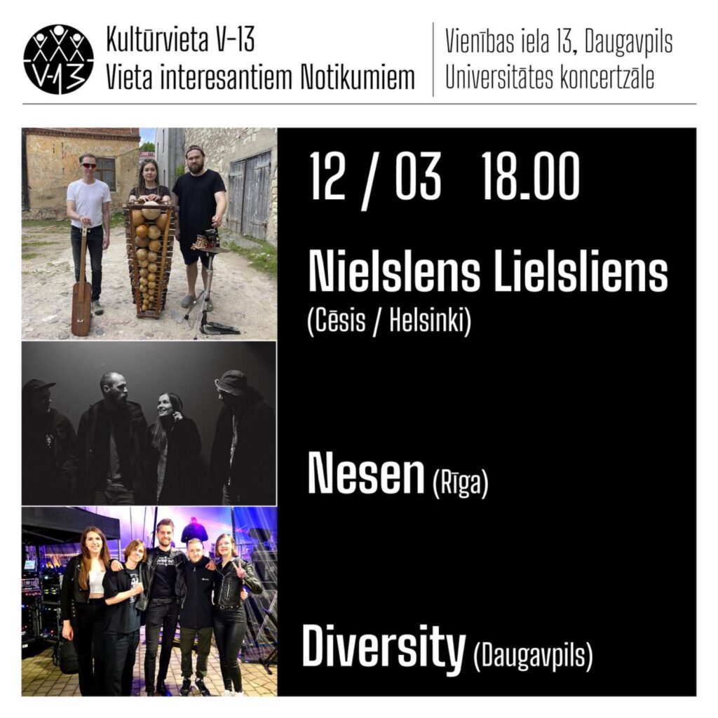 12. martā plkst. 18.00 Daugavpils Universitātes koncertzālē “V-13” norisināsies grupas “Nielslens Lielsliens”, “Nesen” un “Diversity” koncerts.