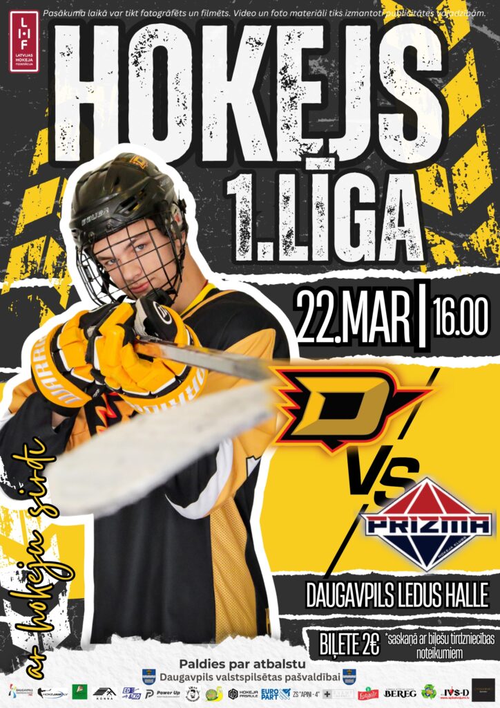 22. martā plkst. 16.00 Daugavpils Ledus hallē norisināsies Latvijas hokeja 1. līgas spēle, kurā HK “Dinaburga/DSS” tiksies ar HK “Prizma”.
