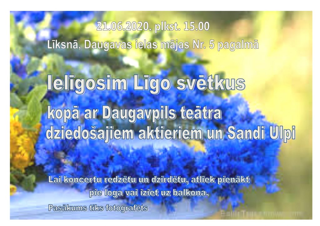 21. jūnijā plkst. 15.00 Līksnā, Daugavas ielas mājas Nr. 5 pagalmā Līksnas kultūras nams aicina visus interesentus ielīgot Līgo svētkus kopā ar Daugavpils teātra dziedošajiem aktieriem un Sandi Ulpi.