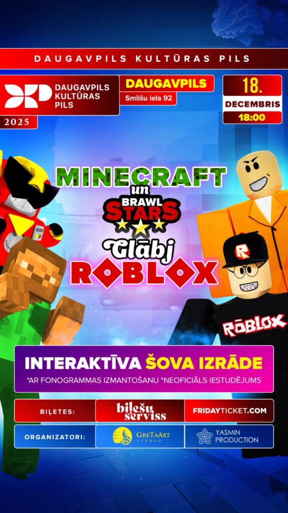 Biļetes: https://lv.fridayticket.com/en/daugavpils/minecraft-brawl-stars-spasaut-roblox-daugavpils-48085.html