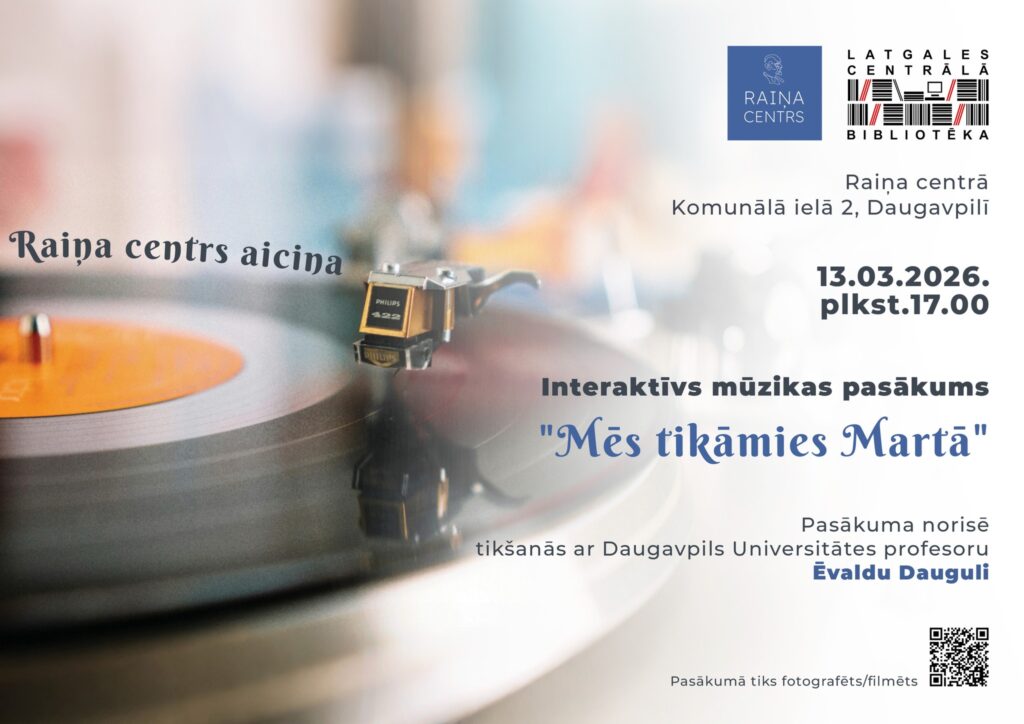 Piektdien, 13. martā, plkst. 17.00 Daugavpils Latgales Centrālās bibliotēkas struktūrvienībā Raiņa centrs (Komunālā ielā 2, 1. stāvā) notiks interaktīvs mūzikas pasākums “Mēs tikāmies martā”.