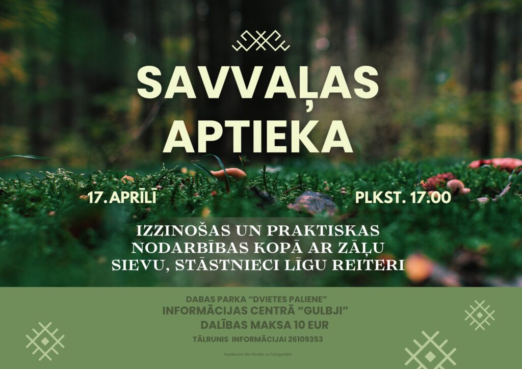 17. aprīlī plkst. 17.00 dabas parka “Dvietes paliene” informācijas centrā “Gulbji” notiks informatīvas un praktiskas nodarbības kopā ar zāļu sievu un stāstnieci Līgu Reiteri.
