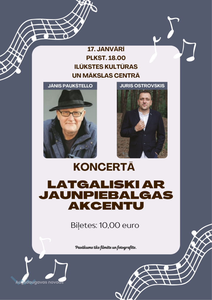 17. janvārī plkst. 18.00 Ilūkstes Kultūras un mākslas centrā notiks Jāņa Paukštello un Jura Ostrovska koncerts “Latgaliski ar Jaunpiebalgas akcentu”.
