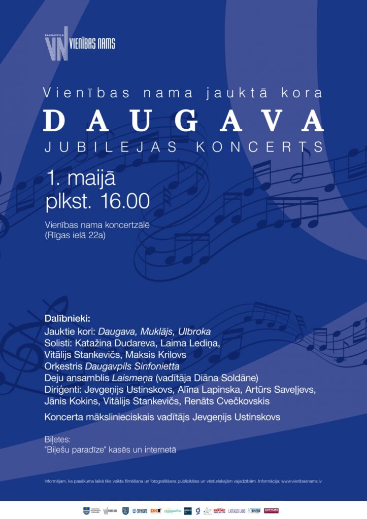 1. maijā plkst. 16.00 Vienības nama koncertzālē notiks jauktā kora „Daugava” jubilejas koncerts.