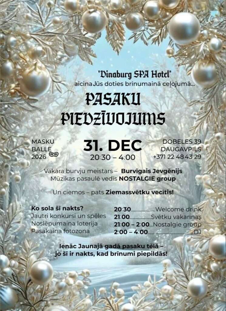 31. decembrī plkst. 20.30 viesnīcā “DinaburgSPA Hotel” norisināsies Jaungada masku balle “Pasaku piedzīvojums”. Ballē jūs sagaidīs maģija, mūzika un neaizmirstama svētku atmosfēra, konkursi un spēles, noslepumaina loterija. Vakara vadītājs — Jevgeņijs Žurno, aizvedīs jūs cauri naktij, kas piepildīta ar pārsteigumiem un spilgtām emocijām. Kā arī būs mūzikas priekšnesums no grupas “Nostalgie group”. Uzdāviniet sev brīnumu, kas paliks atmiņā visu gadu!