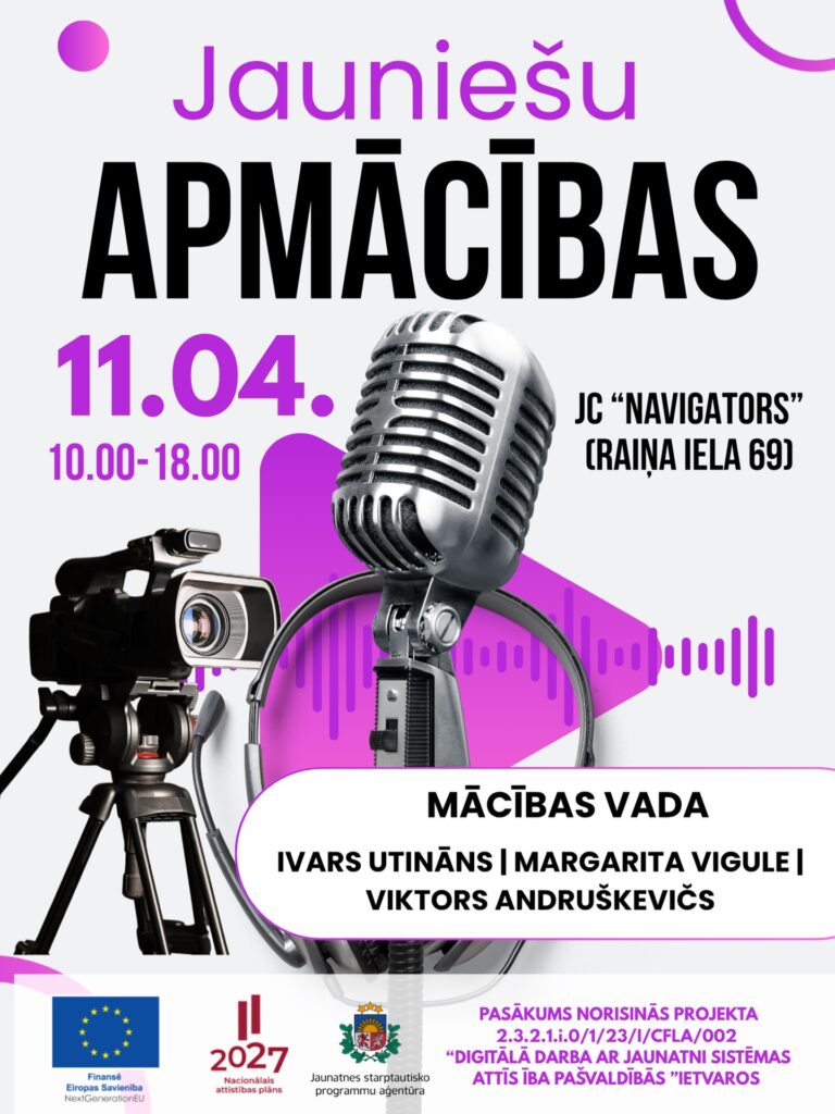 11. aprīlī Jaunatnes centrā “Navigators” (Raiņa ielā 69, Daugavpilī) notiks jauniešu apmācības par video veidošanu un mediju satura radīšanu. Pasākums pulcēs jauniešus, kuri vēlas attīstīt savas digitālās prasmes, radošumu un iemaņas darbā ar mūsdienu mediju vidi.