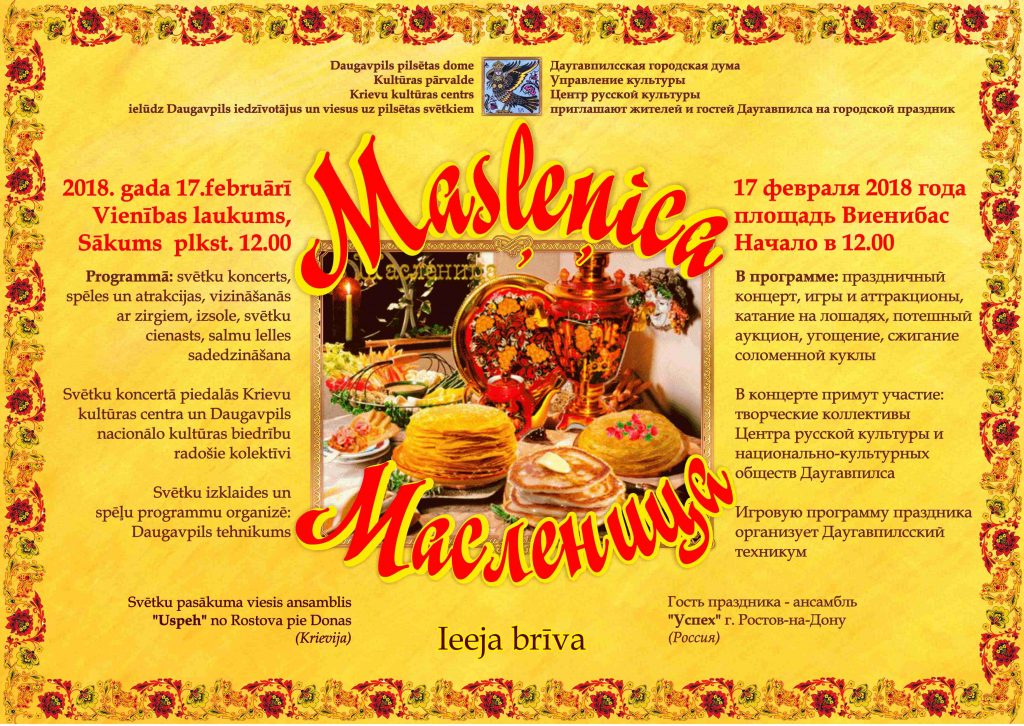 Šī gada 17. februārī plkst. 12:00 Daugavpilī, Vienības laukumā, notiks tradicionālā Masļeņicas svinēšana.