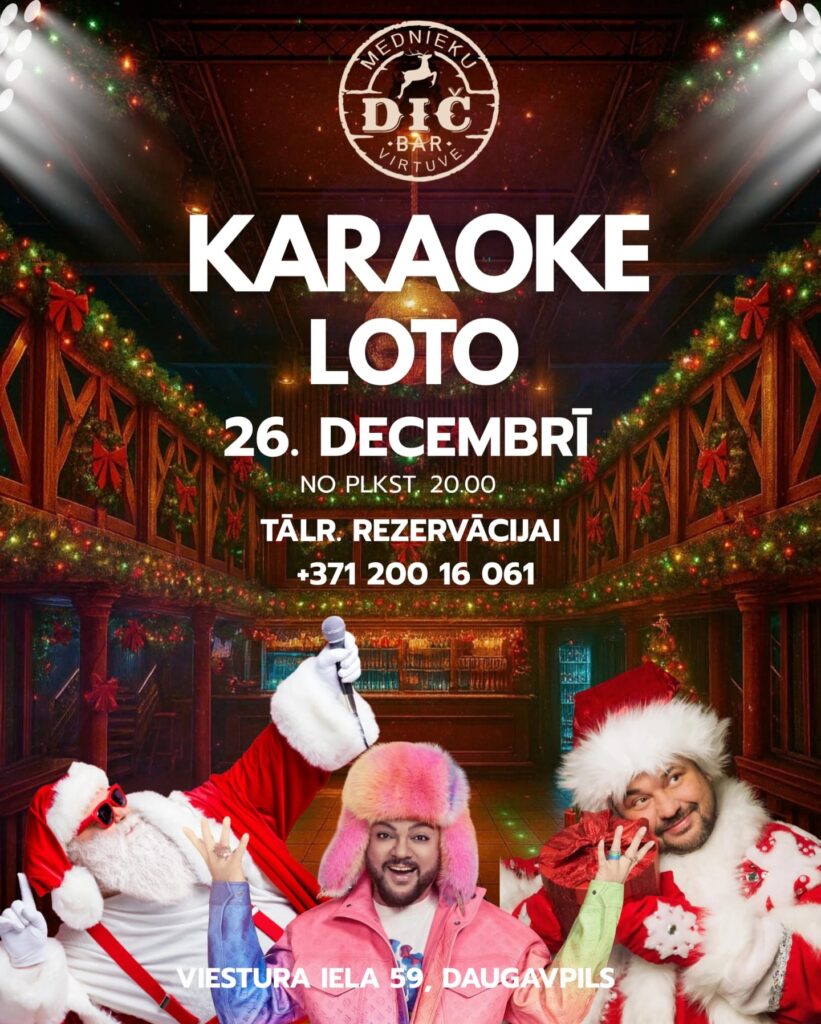 26. decembrī plkst. 20.00 restobārā “DIČ BAR” norisināsies karaoke loto spēle. Karaoke loto – tas ir unikāls ballītes formāts, kas apvieno karaoke, spēli un viktorīnu. Šī spēle apvieno un saliedē, rada īstu svētku atmosfēru. Lieliska ideja korporatīviem pasākumiem un draudzīgiem kolektīviem.