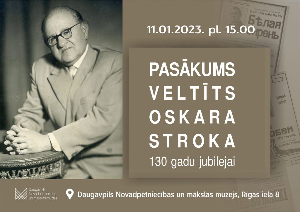 11. janvārī plkst. 15.00 Daugavpils Novadpētniecības un mākslas muzejs aicina uz Oskara Stroka 130 gadu jubilejas atceres pasākumu – muzikāli teatrālu izrādi “Oskars Stroks – tango karalis”.