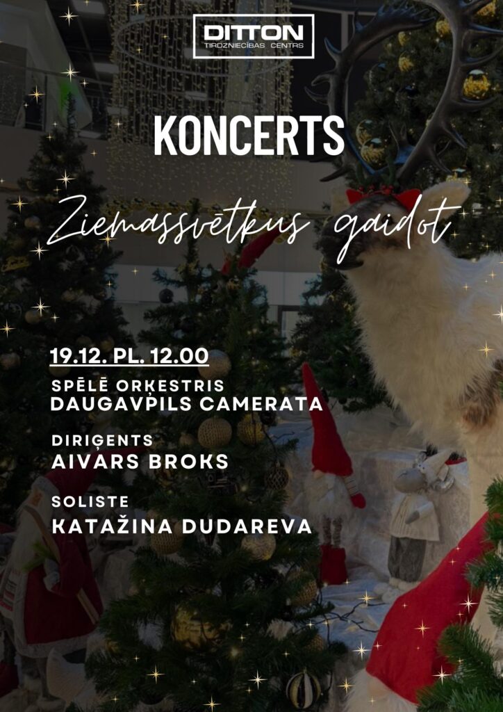 19. decembrī plkst. 12.00 TC “Ditton” norisināsies svētku koncerts “Ziemassvētkus gaidot”.  Šajā īpašajā laikā telpu piepildīs pasaulē iemīļoti svētku meldiņi, kā arī Latvijā zināmas un mīlētas Ziemassvētku melodijas, kas noskaņos jūs gaidāmajiem svētkiem! Spēlē orķestris “Daugavpils Camerata” un soliste Katažina Dudareva, diriģents Aivars Broks.