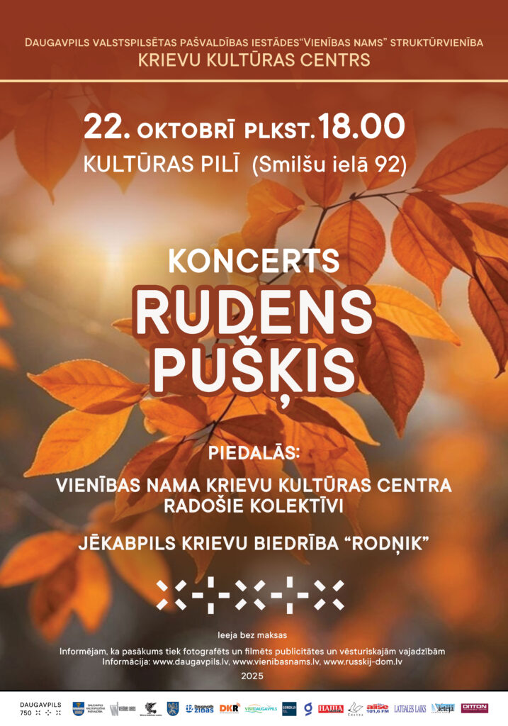 22. oktobrī plkst. 18.00 Daugavpils Kultūras pilī (Smilšu iela 92) Vienības nama Krievu kultūras centrs rīko koncertu „Rudens pušķis”.