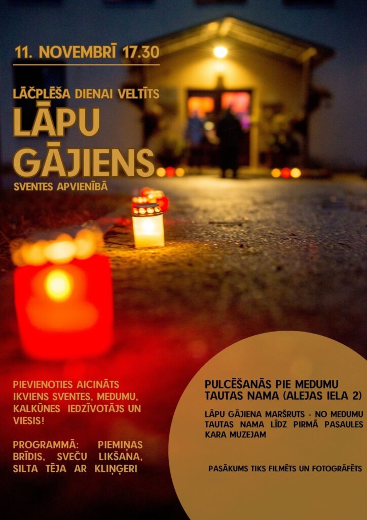 Lāpu gājiens Sventes apvienībā Datums: 11.11.2025Laiks: 17:30Norises vieta: No Medumu tautas nama 11. novembrī plkst. 17.30 notiks Lāpu gājiens no Medumu tautas nama līdz Pirmā pasaules kara muzejam. Pievienoties aicināts ikviens Sventes, Medumu un Kalkūnes iedzīvotājs un viesis.