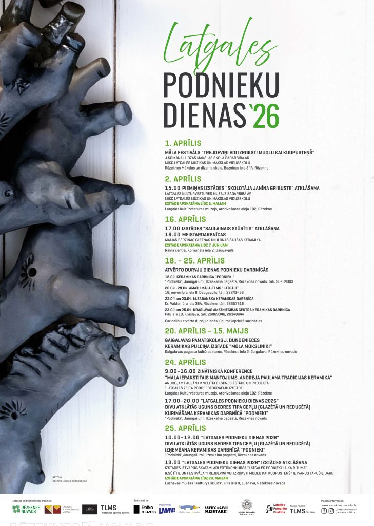 18.04. – keramikas darbnīcā “Podnieki”, Jaungailumi, Ilzeskalna pagasts, Rēzeknes novads, tālr. 26404003;