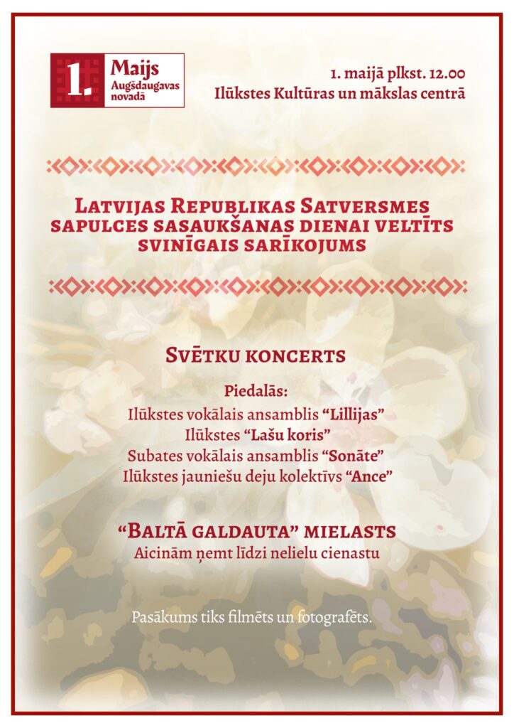 1. maijā plkst. 12.00 Ilūkstes Kultūras un mākslas centrā notiks Latvijas Republikas Satversmes sapulces sasaukšanas dienai veltīts svinīgais sarīkojums.