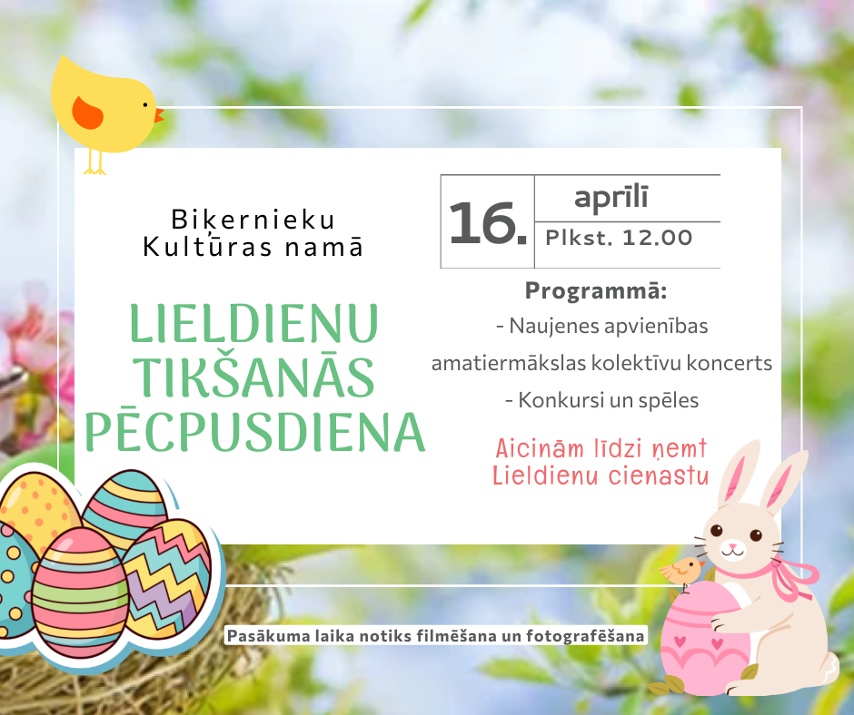 Lieldienu tikšanās pēcpusdiena Datums: 16.04.2026Laiks: 12:00Norises vieta: Biķernieku Kultūras nams 16. aprīlī plkst. 12.00 Biķernieku Kultūras namā notiks Lieldienu tikšanās pēcpusdiena. Programmā: Naujenes apvienības amatiermākslas kolektīvu koncerts Konkursi un spēles Aicina līdzi ņemt Lieldienu cienastu!