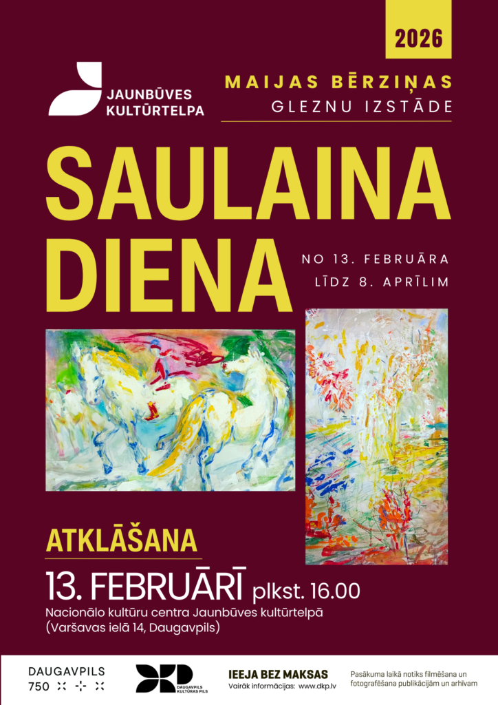 Piektdien, 13. februārī, plkst. 16.00 Jaunbūves kultūrtelpā notiks Maijas Bērziņas izstādes “Saulaina diena” atklāšanas pasākums. Izstāde aicina skatītājus izjust vasaras gaismu un siltumu. Mākslinieces daiļrade izstaro patiesu dzīvesprieku, saules enerģiju un harmoniju.