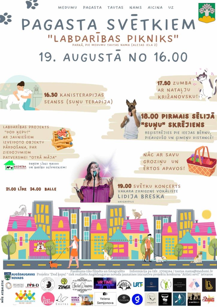 19. augustā no plkst. 16.00 visi laipni aicināti uz MEDUMU PAGASTA SVĒTKIEM “Labdarības pikniks” (pie Medumu Tautas nama, Alejas iela 2)! Šogad svētki veltīti labdarībai, visas aktivitātes būs virzītas dzīvnieku patversmes “Otra māja” atbalstam.