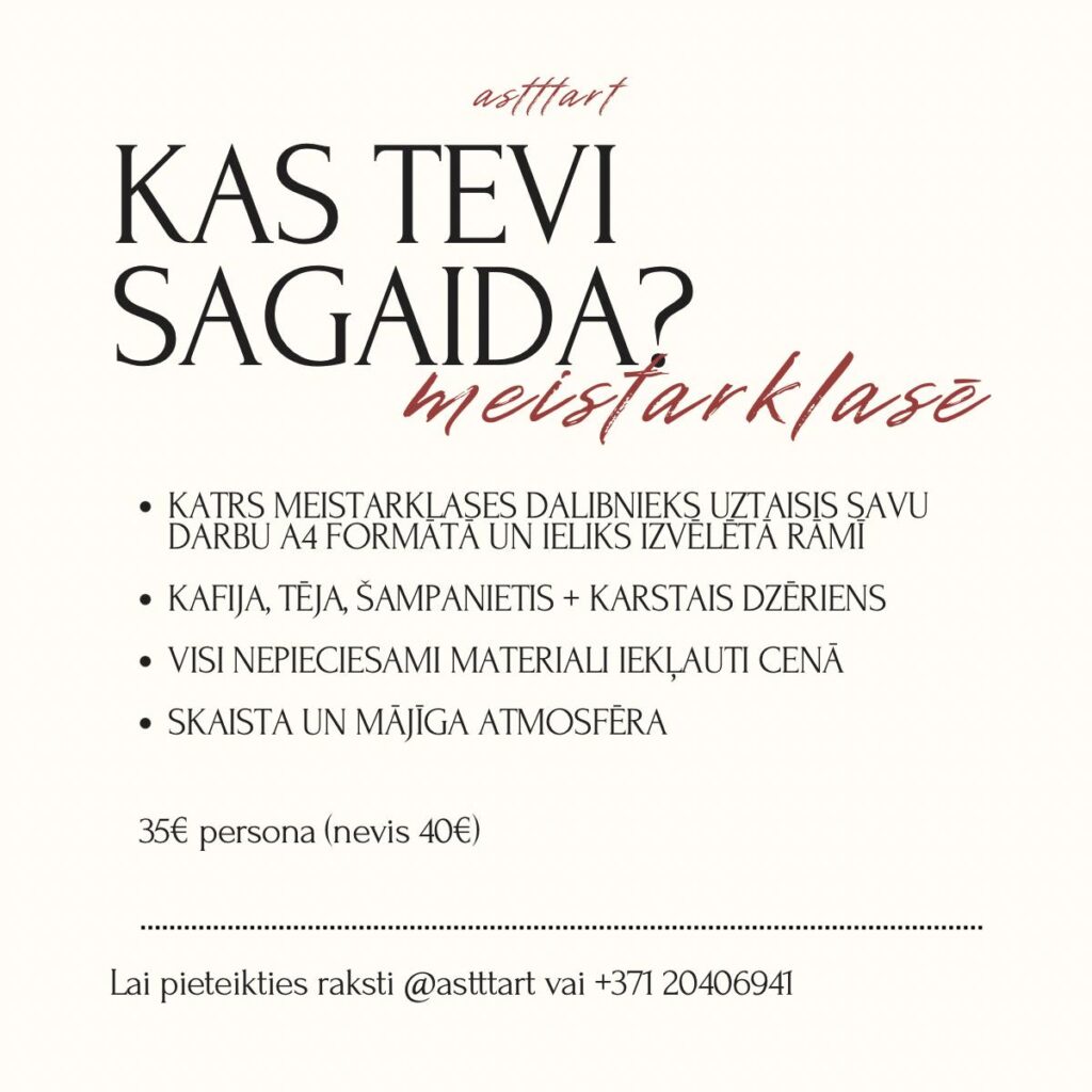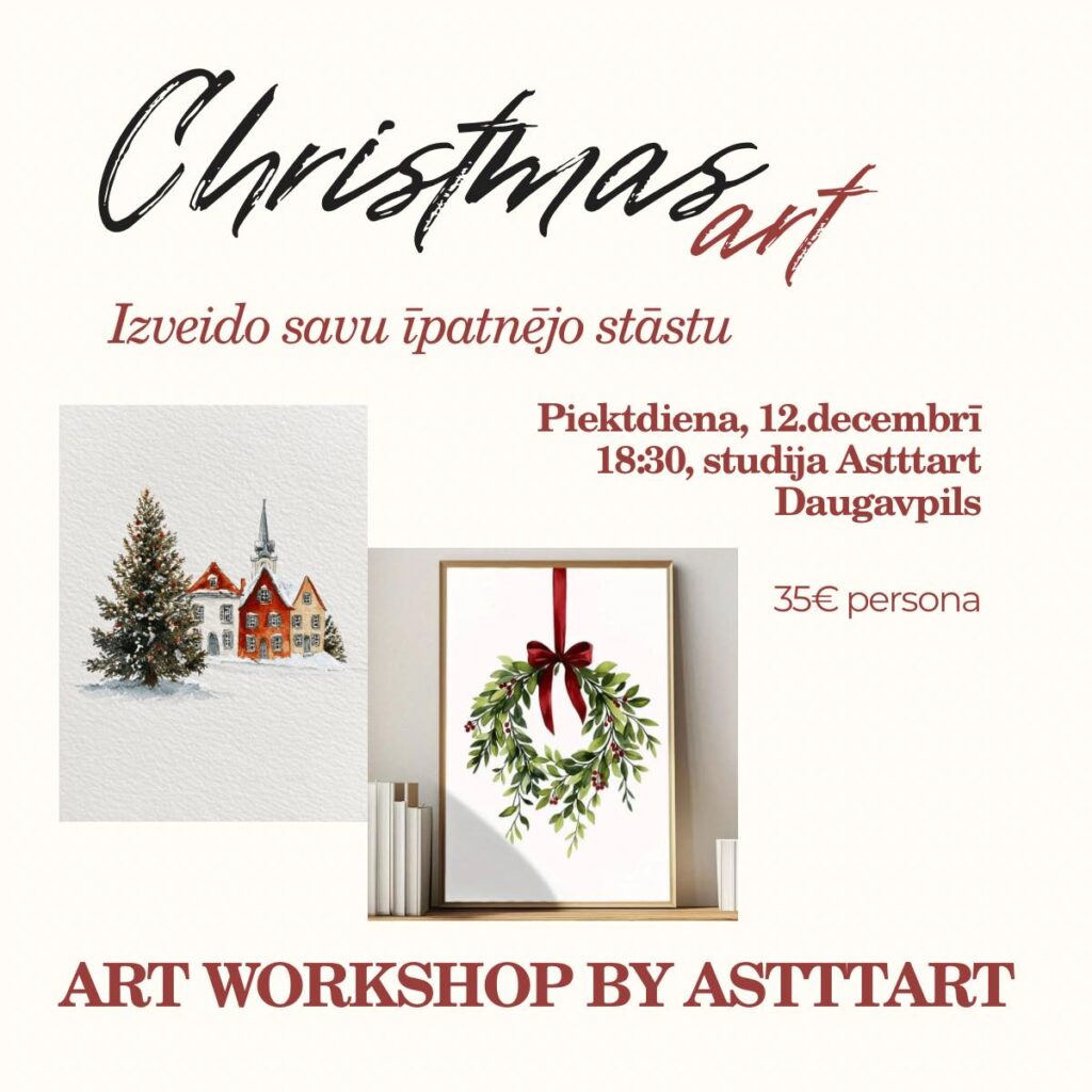 12. decembrī plkst. 18.30 studijā “Astttart” notiks meistarklase “Ziemassvētku glezna”. Meistarklases laikā tiks izveidota glezna A4 formātā un tiks ielikta izvēlētā rāmītī. Jūs sagaida silta atmosfēra, radošums un neliels mierpilna brīdis decembra vidū.
