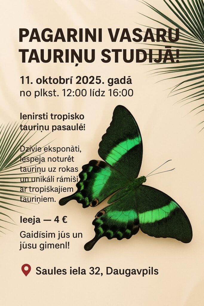 11. oktobrī no plkst. 12.00 līdz 16.00 ir iespējams apmeklēt tauriņu studiju “Fly.Fly.lv” un ielūkoties burvīgajā tropisko tauriņu pasaulē. Tevi sagaidīs dzīvi tropiskie tauriņi, dažādu sugu tauriņi rāmīšos, mājīga atmosfēra un spilgtas emocijas!