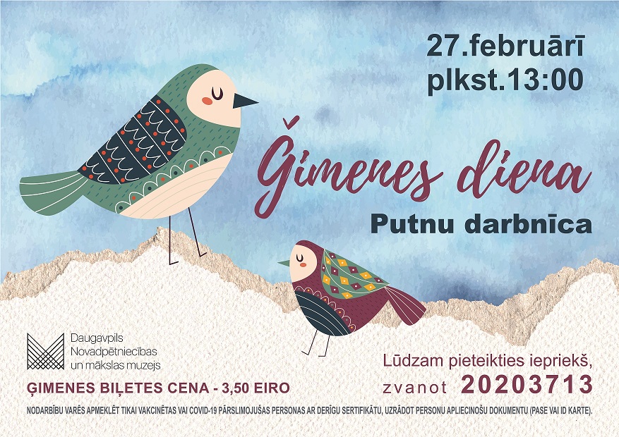 27. februārī Daugavpils Novadpētniecības un mākslas muzejā (Rīgas ielā 8) “Ģimenes dienas” ietvaros notiks radošā “Putnu darbnīca”, kurā katram apmeklētājam būs iespēja izveidot savu pavasara vēstnesi .