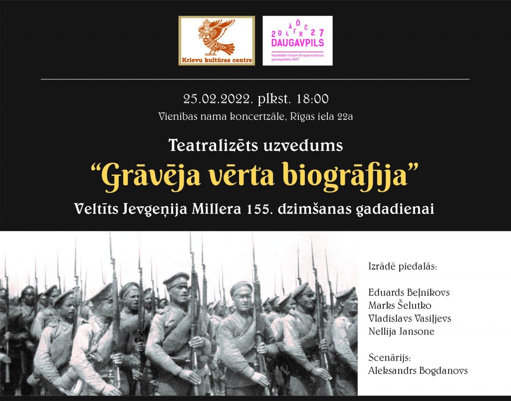 25. februārī plkst. 18:00 Vienības nama koncertzālē (Rīgas iela 22a) notiks Krievu kultūras centra teatralizēts uzvedums “Grāvēja vērta biogrāfija”, kas veltīts Jevgeņija Millera 155. dzimšanas gadadienai.