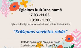 No. 7. līdz 11. martam plkst. 10.00 – 12.00 Eglaines kultūras namā notiks Eglaines darbīgo sieviešu rokdarbu un hobiju darbu izstāde “Krāšņums sievietes rokās”.