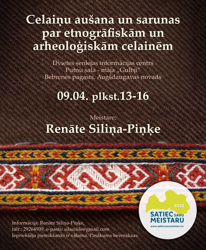 9. aprīlī no plkst. 13.00 – 16.00 Dvietes senlejas informācijas centra Putnu salas “Gulbjos” būsiet laipni gaidīti piedalīties celaiņu aušanā un sarunās par etnogrāfiskām un arheoloģiskām celainēm. Pasākumu “Satiec savu meistaru!” rīko Latvijas Nacionālais kultūras centrs sadarbībā ar novadu pašvaldībām un meistariem visā Latvijā.