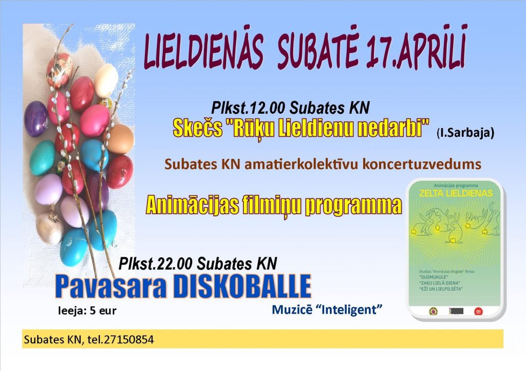 Pavasaris nāk, tuvojas Lieldienas! Ar saulīti, baznīcu zvanu priecīgām skaņām, ar olu krāsošanu un olu kaujām, ar kopīgu līksmošanu. Subates kultūras nams piedāvā izbaudīt svētkus, kas norisināsies 17.aprīlī plkst. 12.00.