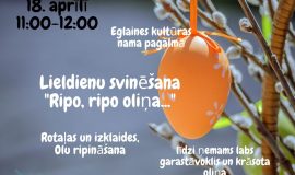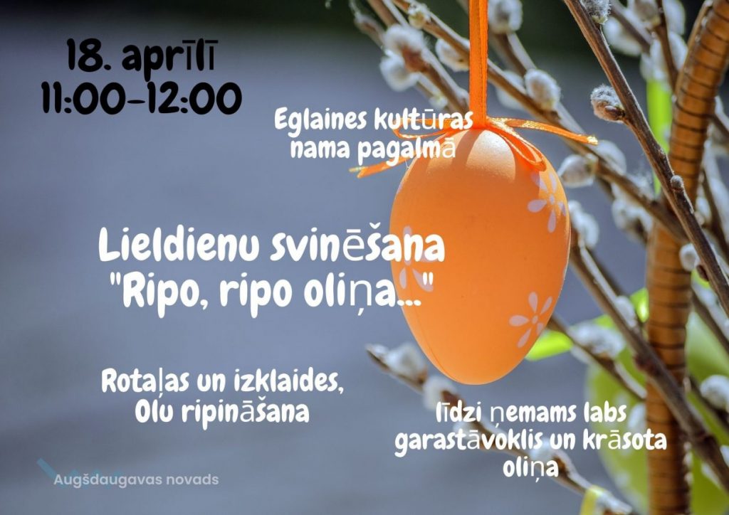 Šī gada 18. aprīlī no plkst. 11.00 līdz plkst. 12.00 Eglaines kultūras nama pagalmā norisināsies Lieldienu svinēšana “Ripo, ripo oliņa…”. Apmeklētājus sagaida jautras rotaļas, izklaides un olu ripināšana. Līdzi aicina ņemt labu garastāvokli un krāsotas oliņas!