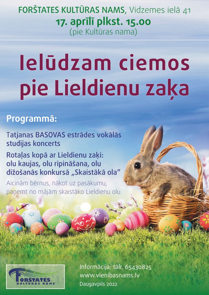 Pirmajās Lieldienās, 17. aprīlī, plkst. 15.00 Forštates kultūras nams ielūdz ciemos pie Lieldienu zaķa! Pasākums notiks pie Forštates kultūras nama Vidzemes ielā 41.