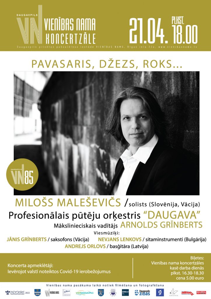 Š. g. 21. aprīlī plkst. 18.00 Vienības nama koncertzālē notiks dziedātāja Miloša Maleševiča (Slovēnija, Vācija) un profesionālā pūtēju orķestra “Daugava” (mākslinieciskais vadītājs Arnolds Grīnberts) koncerts “Pavasaris, džezs, roks…”.