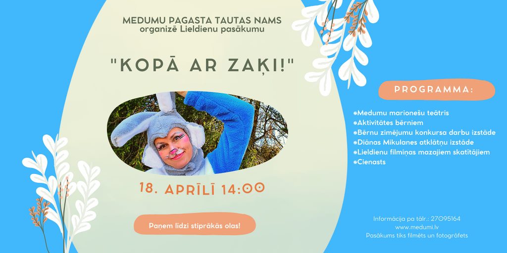 Šī gada 18. aprilī, plkst 14.00 visi tiek mīļi aicināt piedalīties Lieldienu pasākumā “Kopā ar zaķi”.