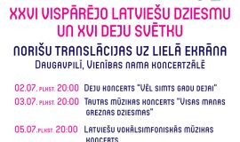 No 2. līdz 8. jūlijam Vienības nama koncertzālē notiks XXVI Vispārējo latviešu Dziesmu un XVI Deju svētku pasākumu translācijas uz lielā ekrāna.