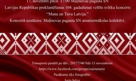 17. novembrī plkst. 17.00 Maļinovas pagasta SN notiks Latvijas Republikas proklamēšanas 104.gadadienai veltīts svētku koncerts “Mana un Tava Latvija”.