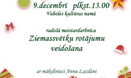 9. decembrī plkst. 13.00 Vaboles kultūras namā visi aicināti piedalīties Ziemassvētku rotājumu meistardarbnīcā, ko vadīs māksliniece Anna Lazdāne.