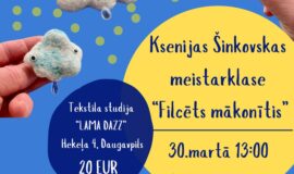 30. martā plkst. 13.00 tekstila studijā “Lama Dazz” notiks meistarklase bērniem un pieaugušiem “Filcēts mākonītis”, kuru vadīs māksliniece Ksenija Šinkovska.