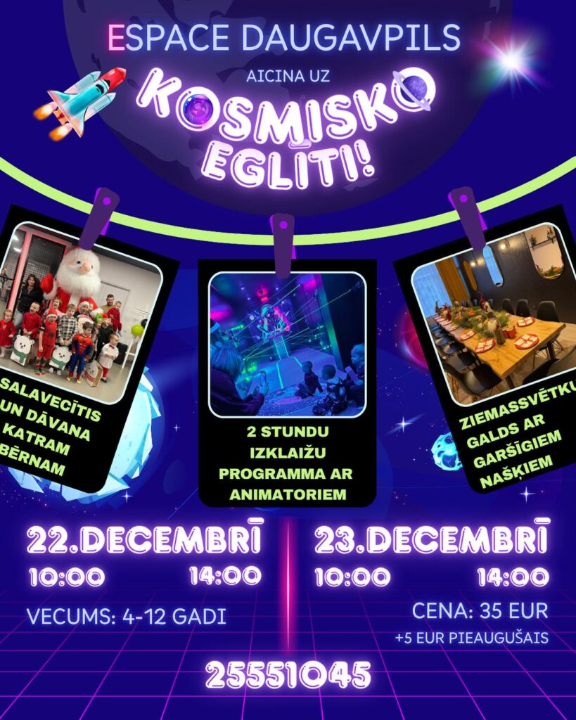 23. decembrī plkst. 10.00 izklaides centrā “Espace” notiks pasākums bērniem “Kosmiskā eglīte”. Pasākumā bērnus gaida – tikšanās ar Ziemassvētku vecīti un dāvana katram bērnam, 2 stundu izklaides programma ar animatorspēlēm un kosmiskiem uzdevumiem, Ziemassvētku galds ar gardiem našķiem!