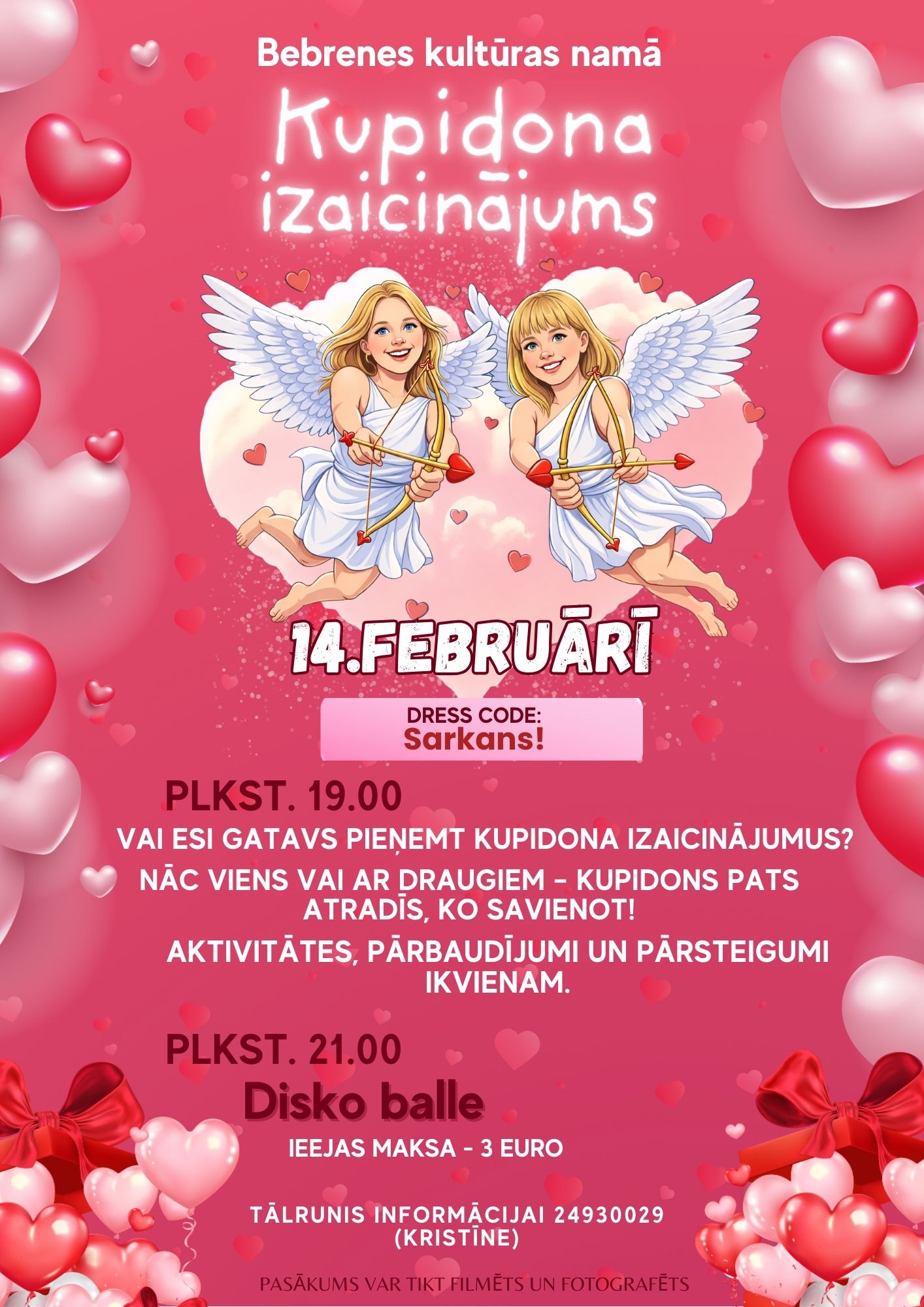 Pasākums “Kupidona izaicinājums” Datums: 14.02.2026Laiks: 19:00Norises vieta: Bebrenes Kultūras nams 14. februārī plkst. 19.00 Bebrenes Kultūras namā norisināsies pasākums “Kupidona izaicinājums”. Plkst. 21.00 – Disco balle. Ieejas maksa – 3 eiro. Dress code: Sarkans!