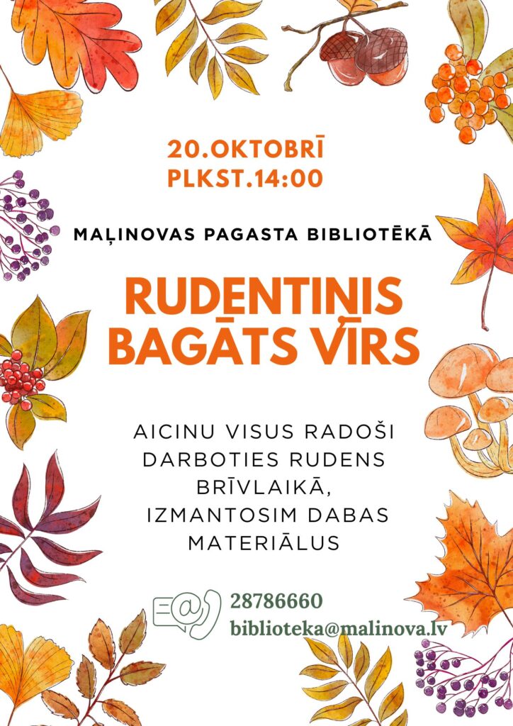 Pasākums “Rudentinis Bagāts vīrs” Datums: 20.10.2025Laiks: 14:00Norises vieta: Maļinovas pagasta bibliotēka 20. oktobrī plkst. 14.00 Maļinovas pagasta bibliotēkā notiks pasākums “Rudentinis Bagāts vīrs”. Aicina visus radoši darboties rudens brīvlaikā, izmantojot dabas materiālus.