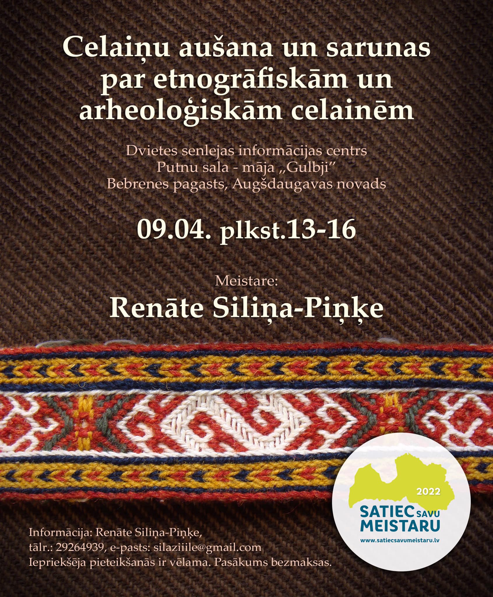 9. aprīlī no plkst. 13.00 – 16.00 Dvietes senlejas informācijas centra Putnu salas “Gulbjos” būsiet laipni gaidīti piedalīties celaiņu aušanā un sarunās par etnogrāfiskām un arheoloģiskām celainēm.
