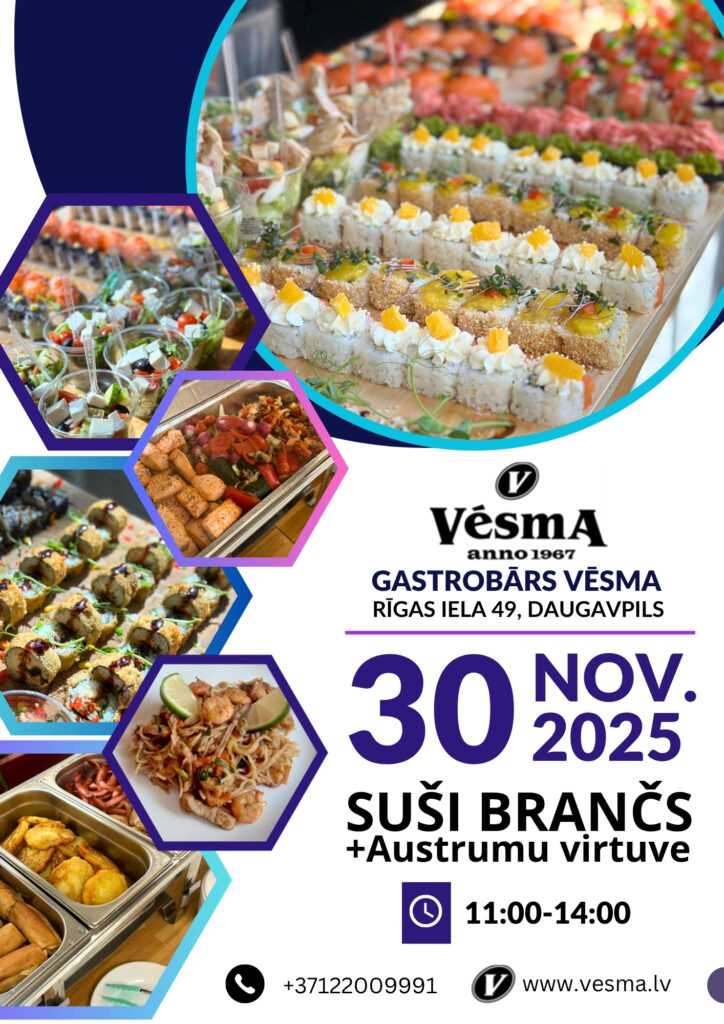 30. novembrī no plkst. 11.00 līdz plkst. 14.00 gastrobārā “Vēsma” notiks suši un austrumu virtuves brančs.