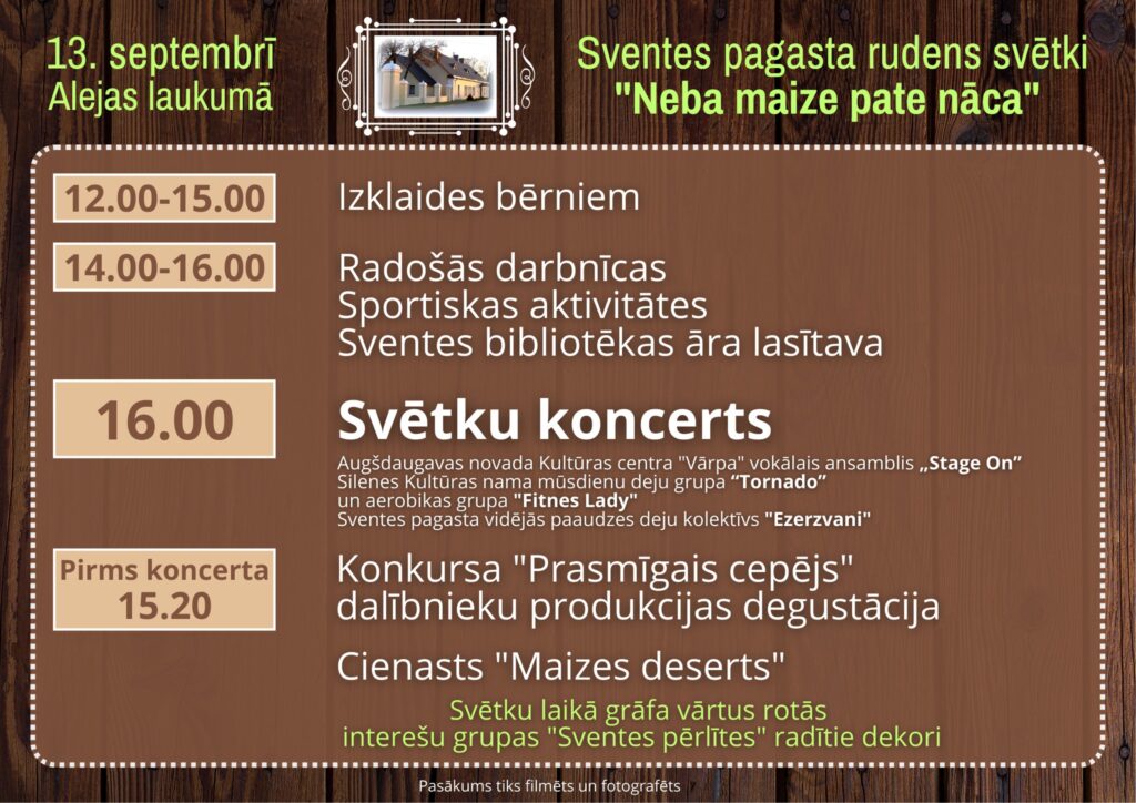 13. septembrī no plkst. 12.00 Alejas laukumā norisināsies Sventes pagasta rudens svētki “Neba maize pate nāca”.