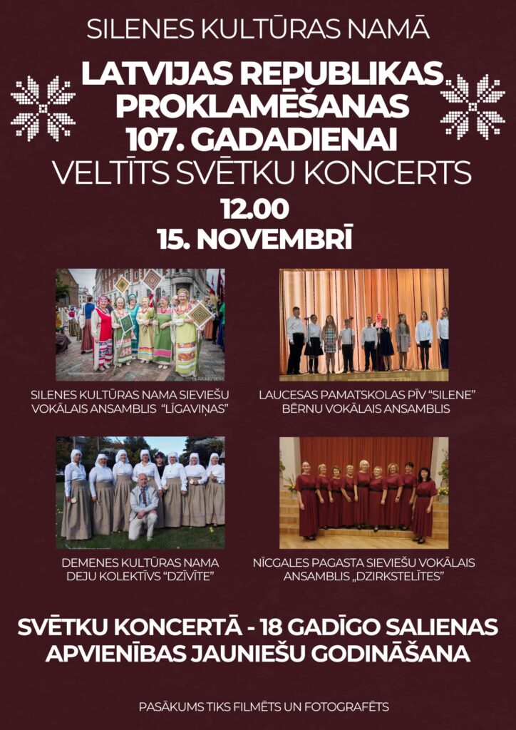 15. novembrī plkst. 12.00 Silenes Kultūras namā notiks Latvijas Republikas proklamēšanas 107. gadadienai veltīts svētku koncerts.
