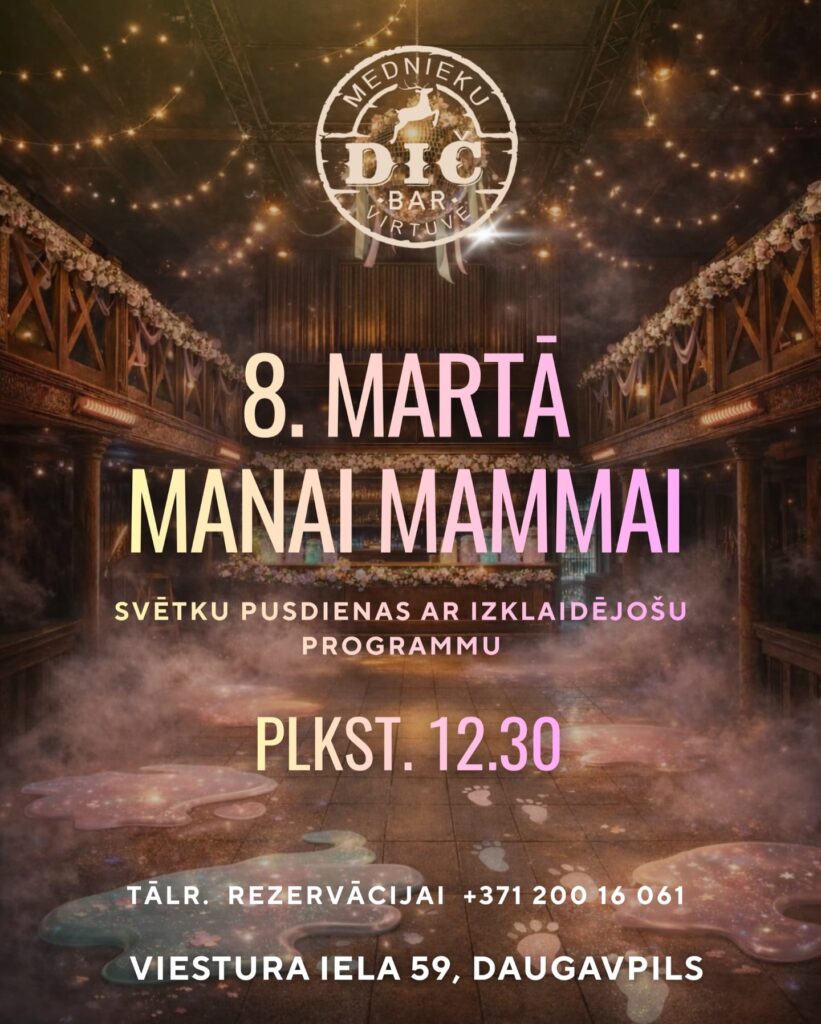 8. martā plkst. 12.30 restobārs “DIČ BAR” aicina uz svētku pusdienām ar izklaidējošu programmu bērniem. Svētku pasākumā mammas var atpūsties, bet bērni ar prieku gatavo viņām pārsteigumus.