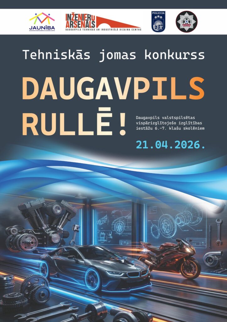 Tehniskās jomas konkursu “Daugavpils rullē!” rīko Daugavpils pilsētas Bērnu un jauniešu centrs “Jaunība” sadarbībā ar Daugavpils Tehnikas un industriālā dizaina centru “Inženieru arsenāls”, Valsts policijas Latgales reģiona pārvaldes Kārtības policijas biroja Prevencijas grupu un Valsts ugunsdzēsības un glābšanas dienesta Latgales reģiona pārvaldi.