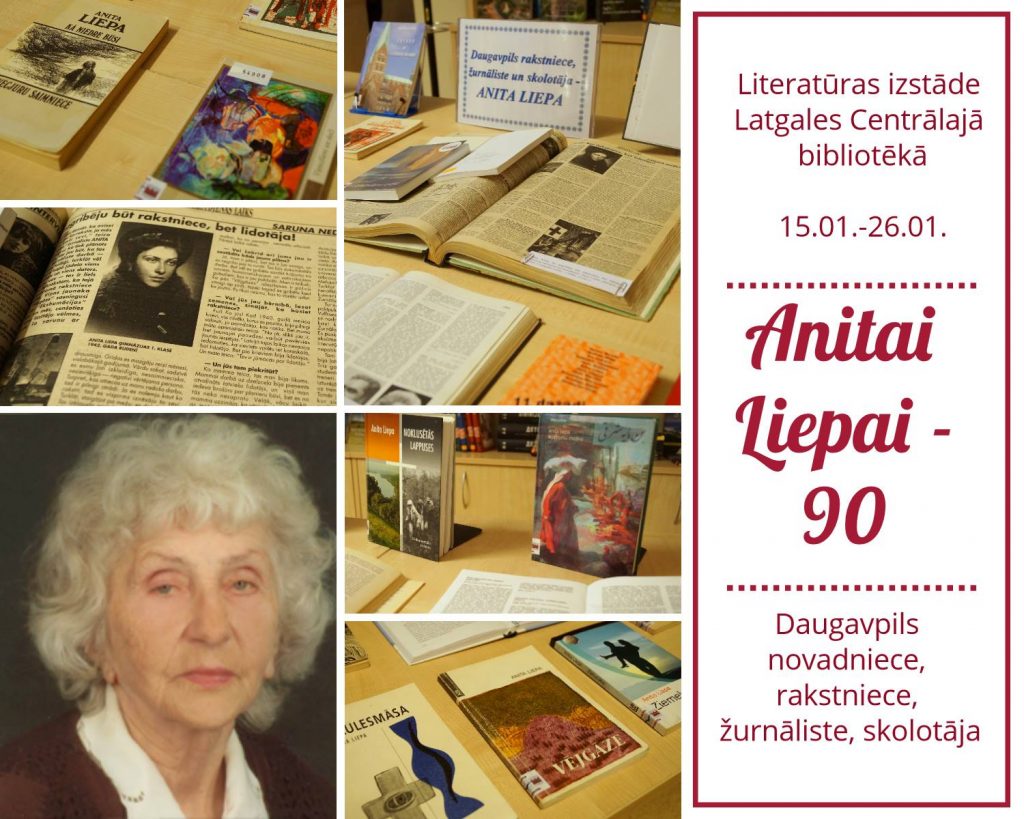 Sveicot novadnieci Anitu Liepu deviņdesmitajā jubilejā, līdz 26. janvārim Latgales Centrālās bibliotēkas (LCB) nozaru literatūras sektorā (Rīgas ielā 22a, 2. stāvā) apskatāma tematiska literatūras izstāde “Daugavpils rakstniece, žurnāliste un skolotāja – Anita Liepa”, kas iepazīstina ar izcilās novadnieces dzīvesgājumu un daiļradi.