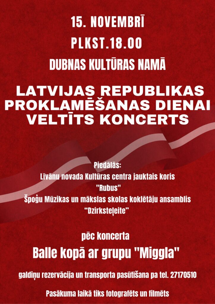 15. novembrī plkst. 18.00 Dubnas Kultūras namā notiks Latvijas Republikas proklamēšanas dienai veltīts koncerts.